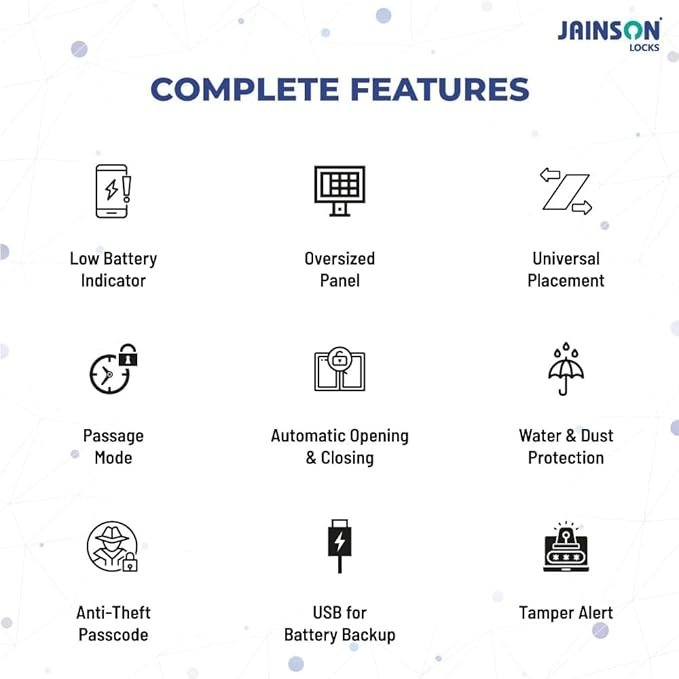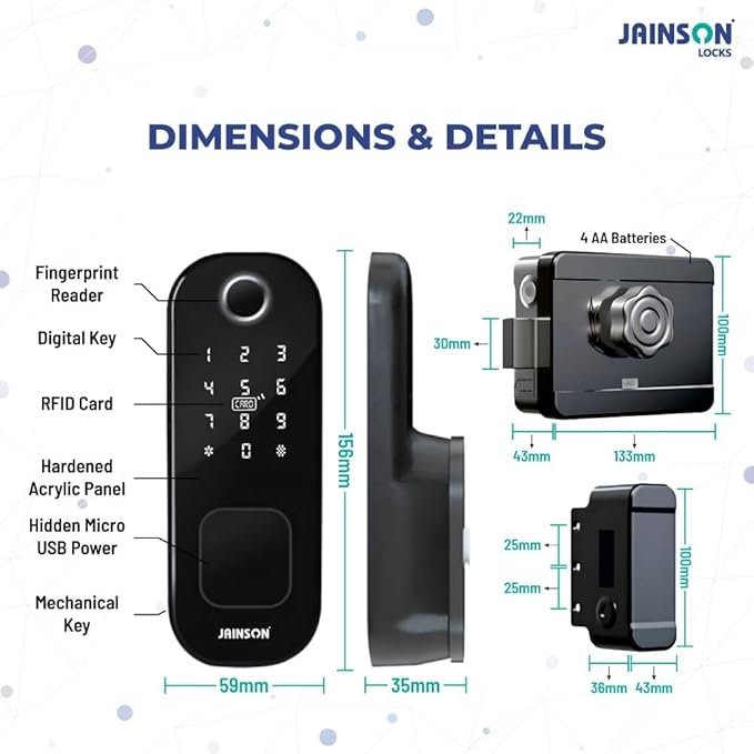 The Jainson Awakey Go Smart Lock offers advanced biometric security with fingerprint, RFID, passcode, and Bluetooth app access. It supports up to 200 fingerprints, features a 360° recognition sensor, and includes an anti-theft passcode for added protection. With Bluetooth 5.0 connectivity, mechanical key backup, and USB battery support, it’s a reliable and modern choice for both homes and offices.